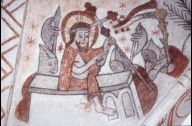 I skibets vestlige hvælving, nærmest indgangsdøren, ses skabelsesberetningen. Billedrækken "læses" fra østkappen, hvor Gud Fader sidder på sin trone og jordskiven er under hans fødder, sol, måne og stjerner ses foroven, og til hver side findes det første fra Skaberens hånd: planter, fisk og dyr. I fligene bliver Adam og Eva skabt. I sydkappen: kundskabens træ, fristelsen. I nordkappen: uddrivelsen af paradiset, Adams og Evas dagligdag og Kain og Abel. Vestkappen viser som motiv et genbillede til skabelsens Gud, derfor placeret modsat denne, nemlig Kristus, der som den opstandne på ( dommedag dømmer de frelste og fortabte. Ved hans højre side de frelste symboliseret ved fredens lilje; til venstre de fortabte,billedliggjort ved dommens sværd. I skibets østlige hvælving ses tre forskellige helgenlegender. I østkappen: Olavssejladsen med Olav den Hellige stående i stævnen af sit skib. I sydkappen ses Sankt Laurentius på den gloende rist. I vestkappen har vi Sankt Jørgen, der kæmper med dragen. I fligene i dette hvælv og i nordkappen afbildes julens fortælling om Jesu fødsel: bebudelsen, Marias møde med Elisabeth og de tre vise mænd, barnemordet i Bethlehem, sædunderet og flugten til Egypten. I koret fortælles hele lidelseshistorien: Jesu bøn i Getsemane have, forrædderiet, forhøret, piskningen, tornekroningen, korsgangen, korsfæstelsen, nedfarten til dødsriget, opstandelsen og himmelfarten. Der findes i kirken to af oprindeligt tolv indvielseskors. De angiver de steder, hvor biskoppen ved kirkens indvielse berørte væggene med vievand. Det ene sidder på sydvæggen i koret, det andet på nordvæggen i skibet.